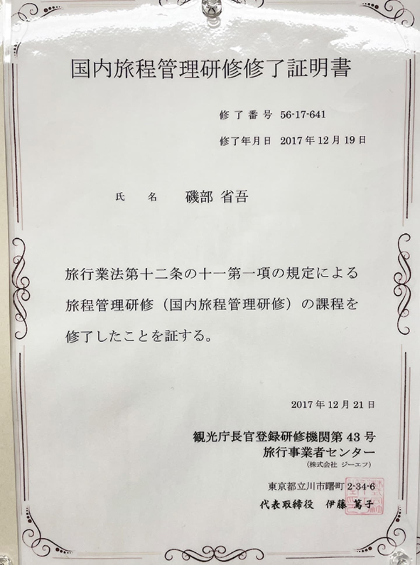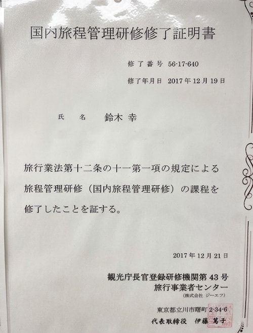 企画旅行が円滑に実施されるため、国内旅程管理研修を受講、終了いたしました。