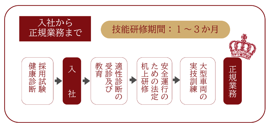 内原交通では、入社後全てのドライバーに、能力に応じて最長3か月の運転技術研修制度を設けています。
