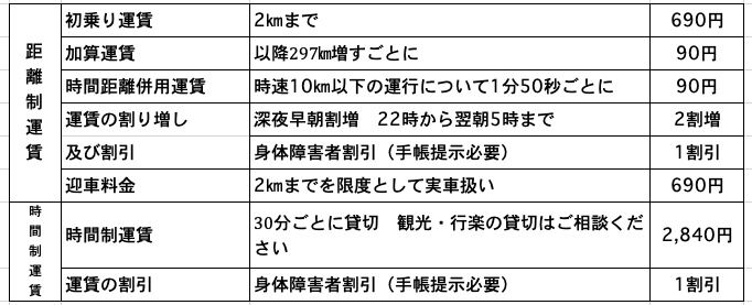 初乗り(2㎞まで)690円〜 加算運賃は90円〜です